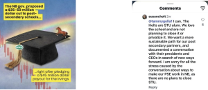 It was not long before Susan Holt started backtracking on these major changes. What is more surprising is the way she chose to do it – through Instagram. In the comments of a post from @new.funswick, an Instagram meme page that was speaking out against these proposed budget cuts, one concerned student tagged Holt, asking for a response. She later replied, insisting that “there are no plans to close STU”. Her use of a social media comment section to spread news critical to universities across the province spiked concern amongst students.